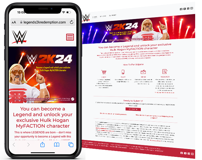 Snipp developed a purchase based program where consumers who purchased any qualifying Mattel WWE products at Target (in-store or online) could go to the program microsite https://www.legends2kredemption.com/ and upload their receipt to get an exclusive in-game content skin for WWE 2K24 – a Hulk Hogan MyFACTION character!