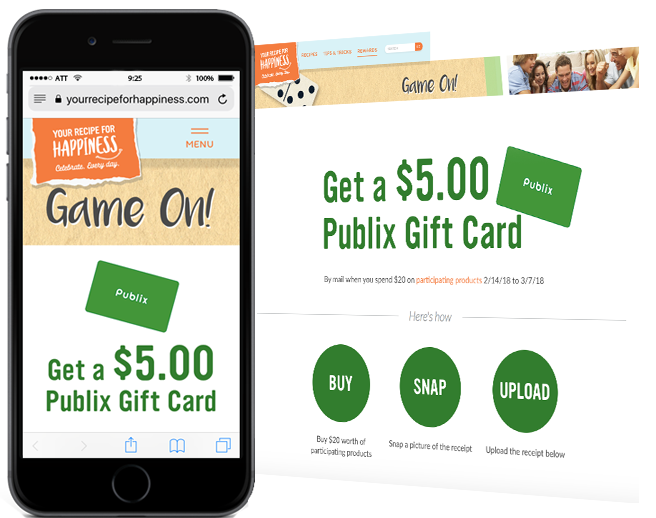Kraft Heinz needed a way to create sales growth at their Publix retail channel. Snipp helped Kraft Heinz plug into the “Your Recipe For Happiness” program, an initiative that engaged consumers through themes of wellness. Consumers could earn a $5.00 Publix Gift Card by purchasing $20 of Kraft Heinz products, and then submitting receipt on the microsite – which Snipp connected via a widget.