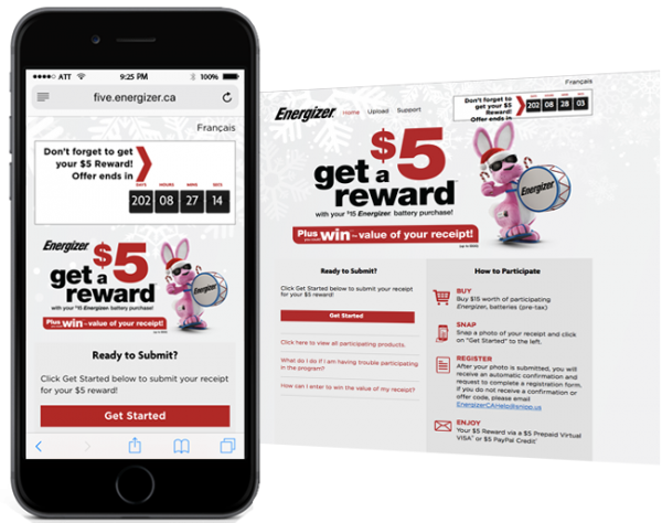 Snipp developed a custom rebate reward program that incentivizes purchase over the duration of the holidays. To participate in the program, consumers simply purchase $15 of qualifying product in a single transaction to receive a $5 rebate reward, redeemable via PayPal or a Virtual Visa card. To further brand engagement, a sweeps overlay is attached to the program; there is a drawing each week for consumers who submit receipt, with a prize of a full rebate on the total receipt purchase amount. All submissions are received through a custom branded microsite, Consumers could also receive a link to the upload site by texting the keywords ENERGIZER 5 (or in French, ENERGIZER CINQ) to the shortcode 76477.