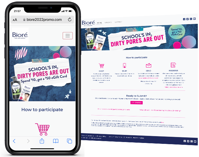 Snipp developed a receipt validation based GWP program where consumers who purchase any 2 Bioré products receive a $50 restaurants.com eGift Card. Snipp enabled multiple submission methods for consumers to submit their receipt - microsite, sms/mms keyword: BIORE and email: redeem@biore2022promo.com