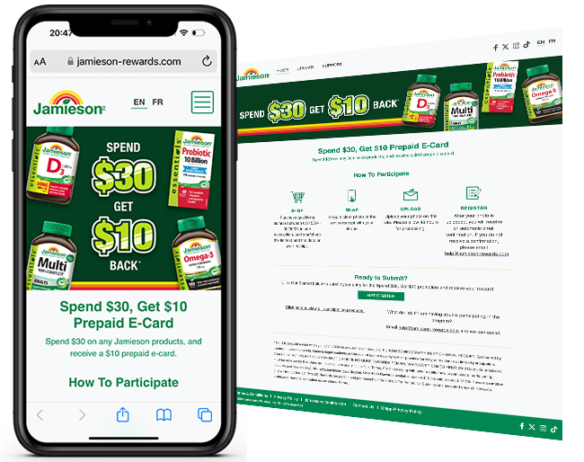 Snipp built a digital reward/rebate program where customers who spent $30 or more in a single transaction across the Jamieson Essentials portfolio could upload a photo of their receipt at https://jamieson-rewards.com/ (English) or https://jamieson-recompense.com/(French) to receive a $10 digital VISA prepaid card. The program was rolled out nationally in both English and French.