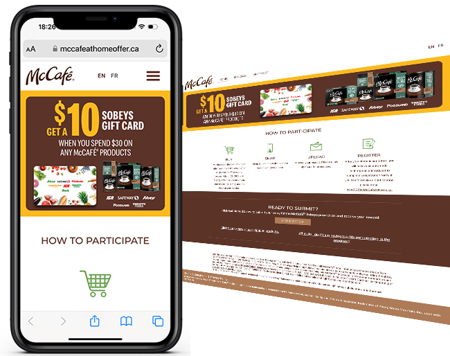 Snipp developed a bilingual gift with purchase program where consumers who purchased $30 with of McCafe products in a single transaction could upload their receipt at https://www.mccafeathomeoffer.ca/ (English) https://www.offremccafeathome.ca/ (French) to earn a $10 Digital Sobeys Gift Card!