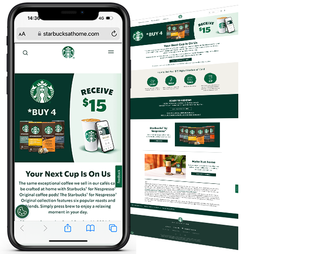 Leveraging Snipp's receipt validation technology Starbucks launched a gift with purchase program where consumers who purchased any 4 Starbucks by Nespresso OL products in a single transaction could go to the program microsite and upload their receipt via a Widget iFramed into the client site - English: https://www.starbucksathome.com/ca/en-ca/gift-card, French: https://www.starbucksathome.com/ca/fr-ca/carte-cadeau to to get a $15 digital Starbucks card to use at a Starbucks café. Snipp managed all backed aspects of the program including microsite development, receipt validation technology, reward fulfillment, legal, customer service, and reporting.