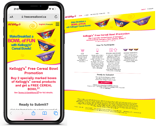 Leveraging the SnippWIN Platform, Snipp developed a purchase based GWP program where consumers who purchased 2 specially marked boxes of Kellogg’s cereal products in a single transaction could upload their receipt at English: https://www.freecerealbowl.ca/ and French: https://www.boldecerealesgratuit.ca/to choose from one of three cereal bowls. Snipp developed the entire program end to end including microsite development, receipt validation, rewards store so consumers could select their bowl(s) of choice, and detailed reporting to provide insight into Kellogg’s shoppers behaviour.