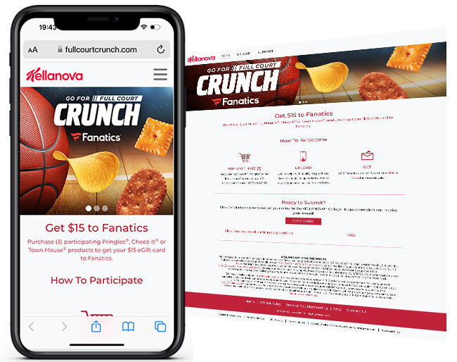 Snipp developed a GWP campaign for Kellanova, allowing consumers to buy any 3 participating products - Pringles, Cheez-It or Town House, take a picture of their receipt and upload to a Snipp built microsite https://www.fullcourtcrunch.com/ to get a reward in the form of a $15 Fanatics e-gift card.
