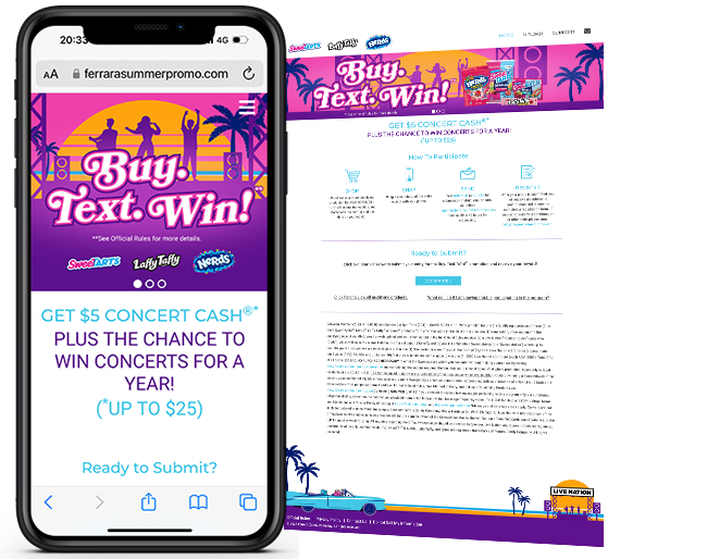 Snipp created a ‘Summer Concert Cash program’ where consumers could Buy 3 participating products and submit their receipt at https://www.ferrarasummerpromo.com to earn a $5 Live Nation promo code. Valid entrants also receive sweeps entry for 1 grand prize and 10 1st place winners win various amounts of Live Nation cash.