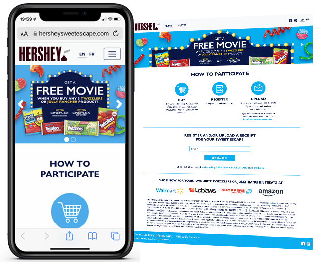 Snipp developed a gift with purchase program with a sweepstakes overlay where consumers who purchase 3 Twizzlers or Jolly Rancher products (or 1 product at Amazon.ca) can upload their receipt at https://www.hersheysweetescape.com/ to get a choice between a free physical or free digital movie ticket, as well as entry into the sweepstakes to win free movies for a year for 2!