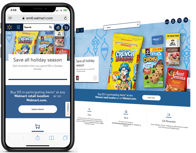 Quaker wanted to incentivize consumers to make cross brand purchase on Walmart.com, increasing basket size and driving sales during the key holiday season.