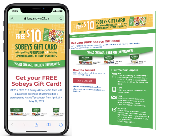 Snipp developed a purchase based program where consumers who spent at least $50 at Sobeys AND purchased 3 Activia products in a single transaction could upload their receipt and register to get a $10 Sobeys Gift Card! Receipt submission could be done by texting the keyword Win to 811811 or online.