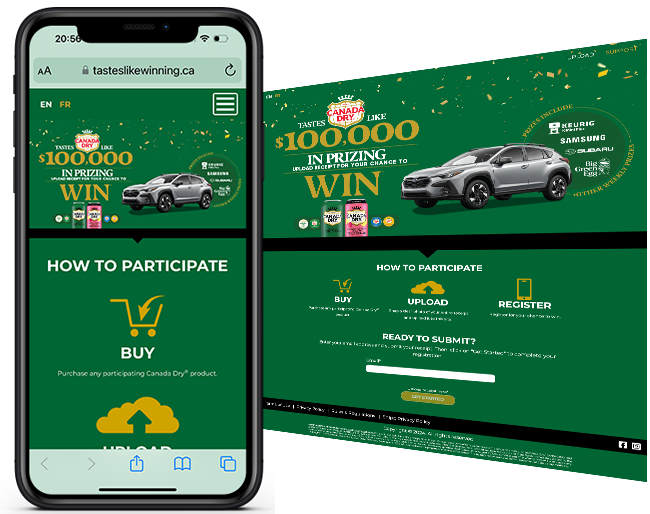 Snipp developed a bi-lingual purchase based instant win campaign where consumers who purchased qualifying Canada Dry products could go to the program microsite - English https://tasteslikewinning.ca, French https://legoutdegagner.ca/ to upload their receipt and register to instantly win one of 168 total prizes! There was over $100,000 in prizing to be won for the program.