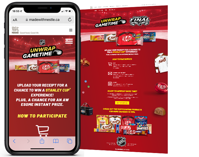 Snipp developed a purchase based instant win program where consumers could upload their receipts at https://www.madewithnestle.ca/Unwrap-Game-Time (EN) or https://www.faitavecnestle.ca/Regalez-vous_au_match (FR) and instantly win 100s of NHL related prizes and gear, as well as be entered into the grand prize to win tickets and an all expensed trip to the NHL finals in 2022!