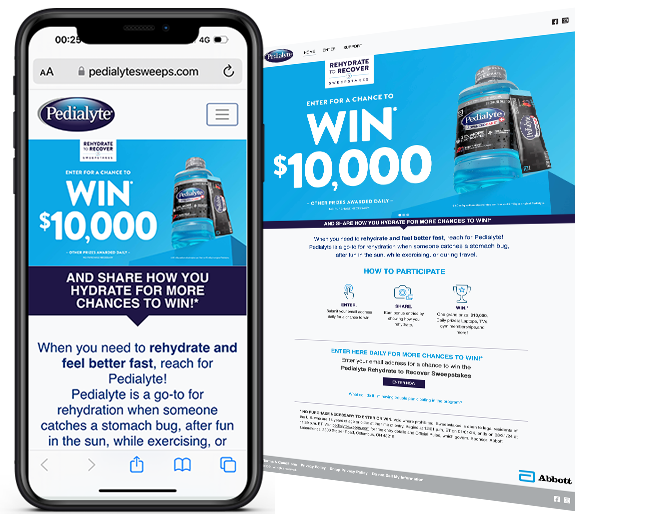 Snipp developed a register to enter instant win and sweepstakes campaign that allowed consumers to complete a registration form at https://www.pedialytesweeps.com/ to receive an instant win game play and 1 entry to the grand prize drawing for each day they enter. In addition, users have the option to submit user-generated content (an image and text with a maximum of 300 words) for additional sweepstakes entries. This is a one-time opportunity per user, granting 20 bonus sweeps entries.