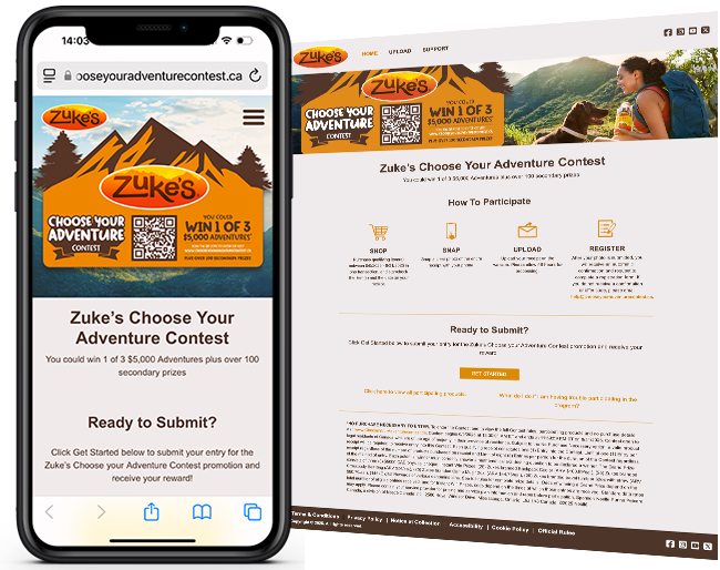 Snipp developed a purchase-based instant win + sweepstakes program where consumers who purchased any Zukes products nationally could visit the program microsite En https://www.chooseyouradventurecontest.ca/, Fr https://www.concourschoisissezvotreaventure.ca/, upload their receipt, and register for a chance to win instant Yeti prizes as well as one of three grand prizes—an ultimate adventure for the winner and their dog. Snipp managed all backend aspects including site development, receipt validation, registration, hosting, sweepstakes and game administration, prize procurement and fulfillment, customer service, and reporting. Snipp also delivered full basket analysis of receipts, providing Zukes with valuable insights into consumer shopping behavior for this new product national launch.