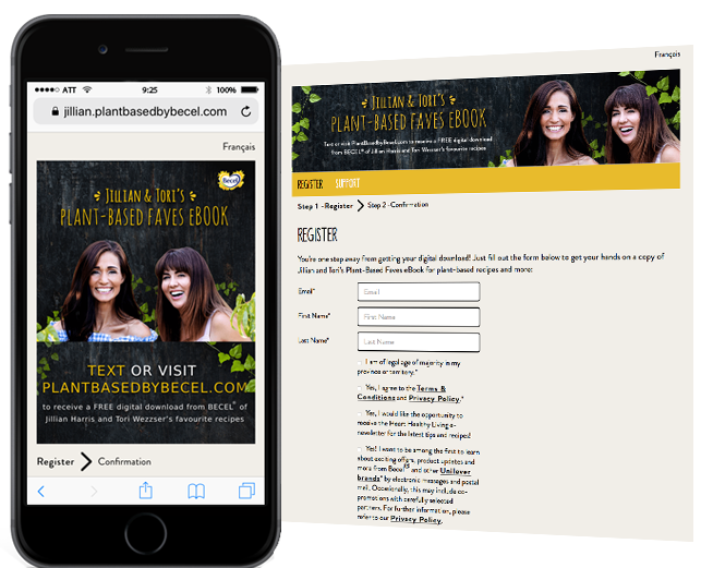Unilever wanted to tap into the influencer power of celebrities to motivate its consumers towards its Becel brand. Snipp created an instant rewards program that offers consumers recipe book downloads featuring Jillian Harris and Tori Wezzer. Consumers simply register on a custom branded microsite to get instant access to the digital download. Consumers can also text BECEL to 811-811 to get directed to the microsite. Consumers in Quebec access a different recipe book featuring Kimberly Lallouz.