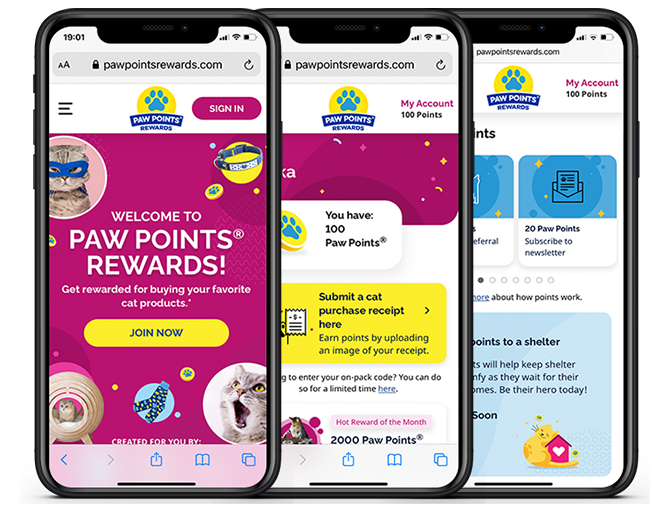 • Extensive Rewards Catalogue - cat themed gifts, product coupons, donate their points to their favorite shelter