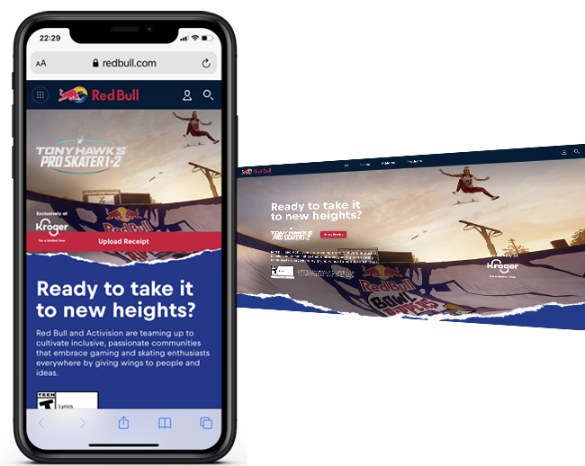 Consumers who purchase qualifying Red Bull products in-store or online can upload a photo of their receipt online athttps://www.redbull.com/us-en/projects/tonyhawksproskater to get an in-game reward code. Snipp integrated into the Red Bull site via a widget.