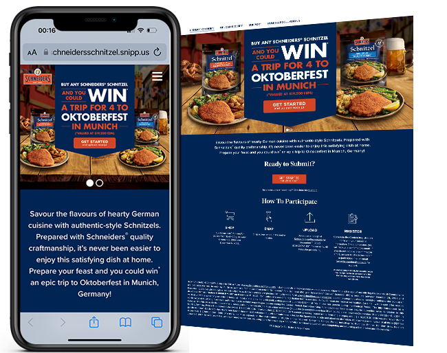 Snipp developed a bi-lingual purchase based sweepstakes program where consumers who purchased qualifying Schneiders Schnitzel products could upload their receipt at https://schneiders.ca/promotions/ (English) https://schneiders.ca/fr/promotions/ (French) and register and earn one sweepstakes entry per participating product purchased to win a trip for 4 to Oktoberfest in Munich!