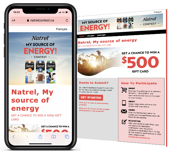 Snipp built a sweepstakes program on our Receipt Processing platform and Contests and promotion software platform where consumers who purchased qualifying Natrel products in a single transaction can upload their receipts online or a chance to win 1 of 10 $500 Canadian Tire Gift Cards.