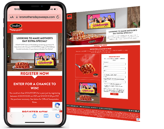 Snipp created a no purchase necessary, register-to-enter sweepstakes where consumers simply need to complete a registration form on https://www.stouffersmothersdaysweeps.com to enter for a chance to win. 10 lucky winners win Stouffer's for 1 year.