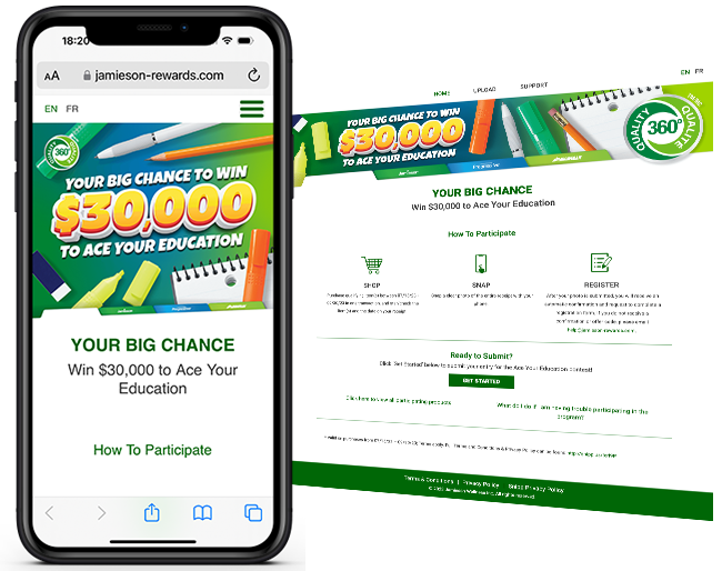 Snipp created an exciting bilingual sweepstakes program in English and French where customers could purchase any Jamieson product across the portfolio, upload their receipt online at jamieson-rewards.com and register for a chance to win $30,000 in school tuition for their child. Consumers received one entry per qualifying product, with a cap of 10 entries per user.