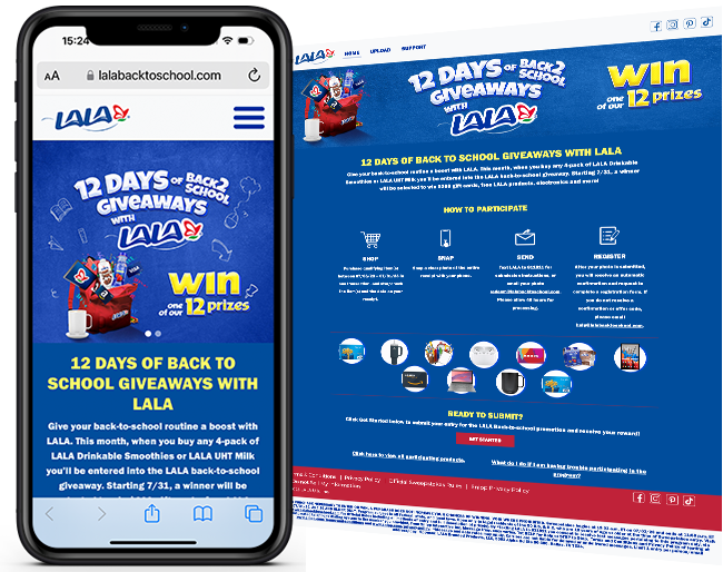 Snipp built a sweepstakes program leveraging our market-leading receipt validation platform where consumers who purchase any 4-pack of Lala drinkable smoothies or Lala UHT Milk can submit their receipts online at lalabacktoschool.com to gain an entry into the sweepstakes.