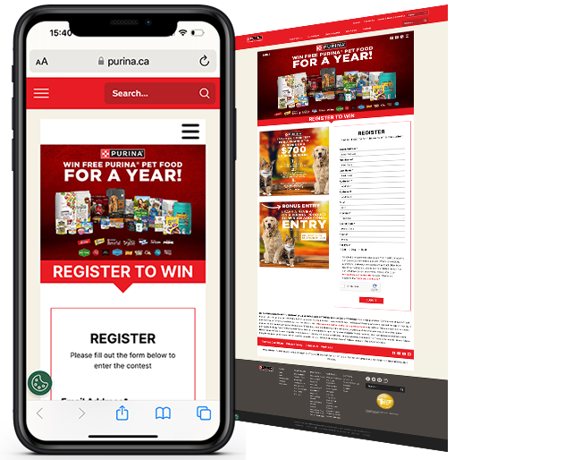 Snipp developed a register to enter sweepstakes where consumers could register on a form via the clients site https://purina.ca/free-purina-for-a-year-contest (English), https://purina.ca/fr/free-purina-for-a-year-contest (French) for a chance to win one of three grand prizes of free Purina for a Year! Consumers could earn an additional sweeps entry for reviewing a Purina product. Snipp managed all backend components of the program including the promotional microsite, data collection, reporting and sweepstakes admin.