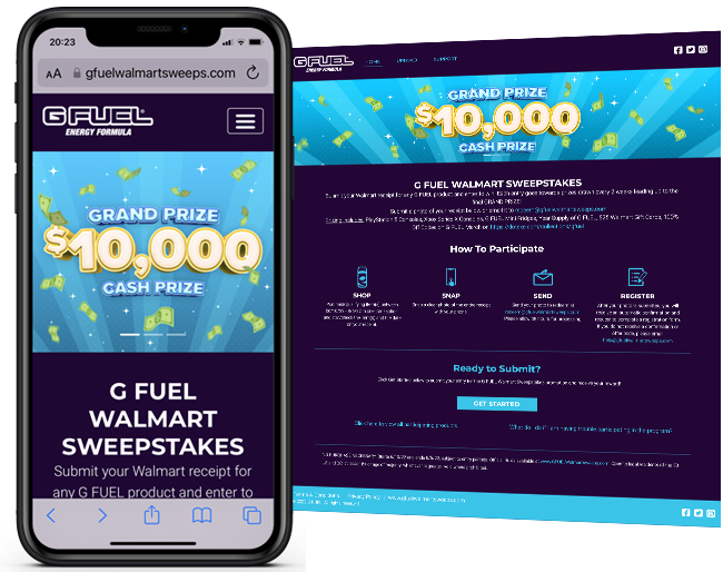 Snipp is running a sweepstakes promotion to drive engagement and sales at Walmart, leveraging G Fuels partnerships. Consumers can submit their purchase receipt at https://gfuelwalmartsweeps.com/ containing any G Fuel product purchased at Walmart - online or instor, to get entry into the Sweepstakes (on a Snipp built microsite) to win exciting gaming theme rewards
