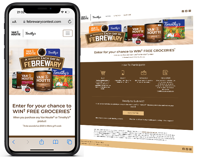 Snipp developed a purchase based sweepstakes program where consumers who purchased qualifying Van Houtte and Timothy's products at Metro (Ontario only) could upload their receipts at https://febrewarycontest.com/ for a chance to win one of 28 prizes of $500 Metro Gift Cards for the 28 days in February! Snipp managed all components of the program including technology, prize procurement and fulfillment, and all sweepstakes administration.