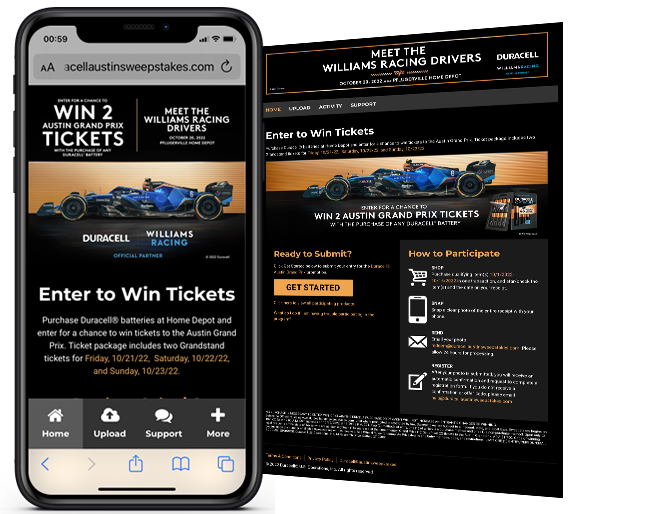 Snipp designed a Sweepstakes promotion with a receipt upload microsite https://www.duracellaustinsweepstakes.com/home to support consumers entering the program digitally, while also including a PO box for mail in AMOEs.