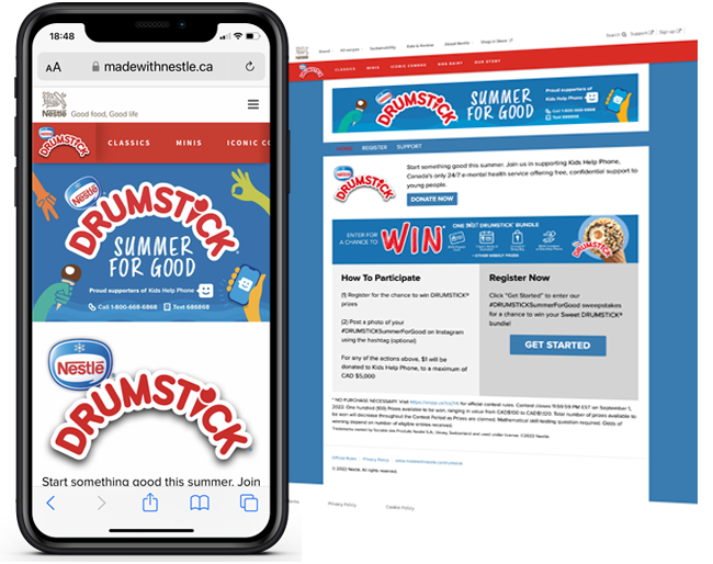 Snipp developed a register only sweepstakes promotion, implemented via a widget on the client website https://www.madewithnestle.ca/drumstick/summer-for-good-contest , where consumers could register on the program site to get entry into the sweepstakes program. Consumers had a chance to win weekly prizes including Nestle Swag bags, as well as entry into the Grand Prize draw to win a years supply of Drumstick, a swag bag, $500 donation to Kids Help Phone, and $100