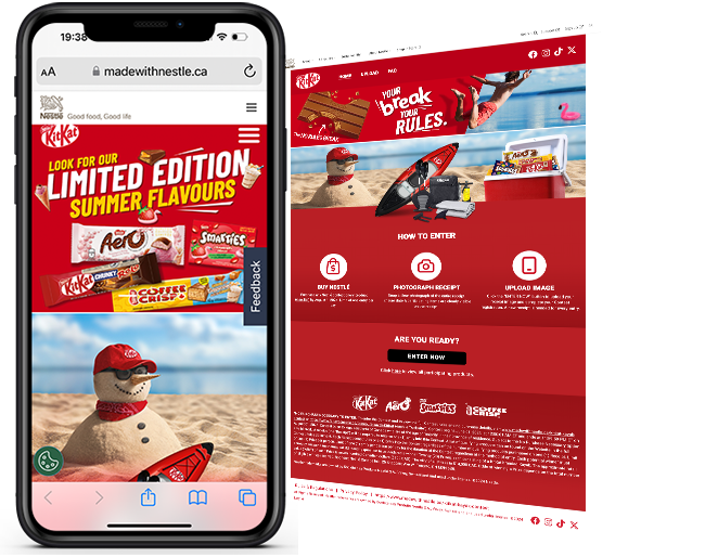 Leveraging Snipp's receipt validation technology, Snipp developed a purchase-based sweepstakes where consumers who purchased any qualifying Nestle product could upload their receipt at English: https://www.madewithnestle.ca/KitKat-kayak-contest French: https://www.faitavecnestle.ca/concours-kayak-KitKat for a chance to win one of twenty custom KITKAT Kayaks! Snipp managed all aspects of the program including technology (integrated via iframe into madewithnestle.ca and their CRM for data collection), contest administration, and prize fulfillment.