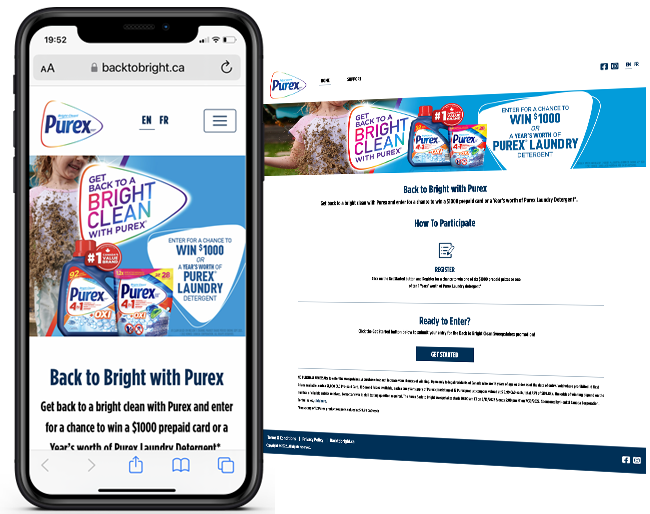 Snipp developed a register to enter sweepstakes promotion where consumers who landed on the program microsite www.backtobright.ca could register for a chance to win one of (6) prizes of a $1,000, as well as (10) secondary prizes of free Purex for a year! Snipp managed all backend development, sweepstakes administration, and prize fulfillment.