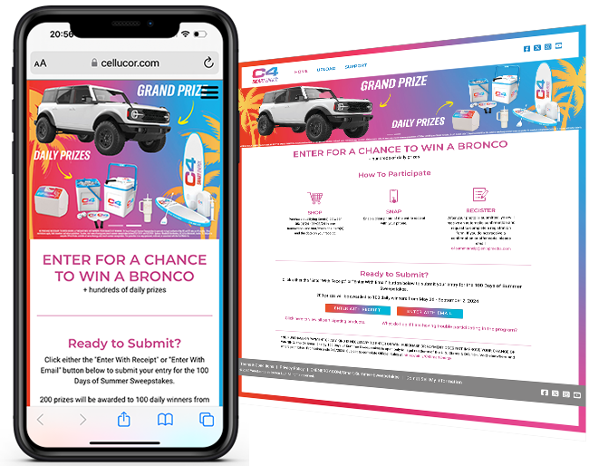 Snipp developed a purchase based sweepstakes program where consumers who purchased any qualifying C4 product could upload their receipt receipt through a Snipp built widget -  afull page iframe on the clients’ site  www.C4energy.com/smart-summer-sweepstakes for a change to win 1 of 100 daily prizes, as well as entry into the grand prize draw to win a Ford Bronco!
