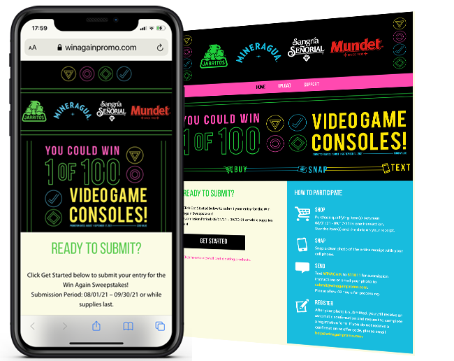 Snipp created a sweepstakes promotion where customers who purchased any participating Novamex beverage, could uploaded a photo of their receipt to receive an entry for a chance to win one of 100 video game consoles. Prizes were awarded in the form of a digital gift card. Consumers could submit their receipt by texting in the keyword WIN AGAIN, via email to submit@winagainpromo.com, or online at https://www.winagainpromo.com/