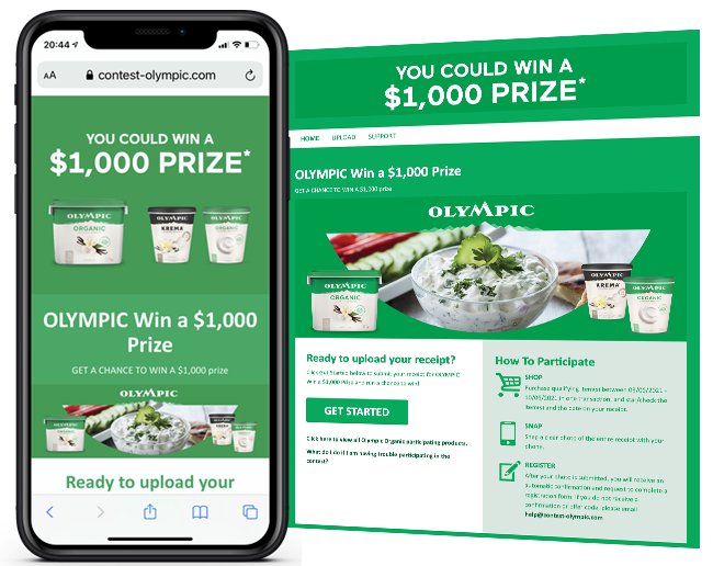 Leveraging Snipp's receipt validation technology, we developed a purchase-based sweepstakes where consumers who purchase qualifying Olympic products can upload their receipt and register for the program on the Snipp hosted microsite https://www.contest-olympic.com/ to earn an entry for each product purchased. Consumers were entered for a chance to win 1 of (20) $100 Pre-Paid MasterCards procured and fulfilled by Snipp.