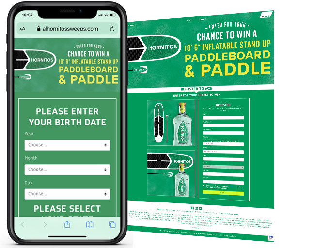 Beam Suntory earned additional display space in Alabama retail outlets by creating exciting displays with Hornitos paddleboards and signage to drive engagement via Snipp’s Text-to-Enter solution and vibrant new Sweeps registration template built on our receipt processing platform. Consumers can text the keyword HORNITOS to 811811 to get a link to enter.
