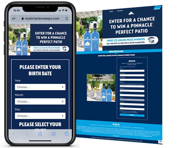 Beam Suntory earned additional display space in North Carolina retail outlets by creating exciting patio themed displays with signage driving entry to win a “Perfect Patio” makeover. Snipp’s mobile Text-to-Enter solution and vibrant new mobile sweeps registration template were used to engage consumers. Consumers can text the keyword PINNACLE to 811811 to get a link to an age and state gated microsite https://www.ncpinnaclesweeps.com to enter.