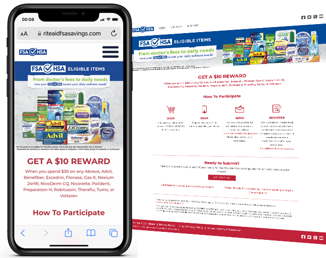Snipp Developed a tiered gift with purchase promotion for RiteAid shoppers of Haleon products. Consumers could spend $30-$59.99, get $10 and spend $60+, get $20. Receipt upload was enabled via Website https://www.riteaidfsasavings.com/, MMS - texting in the keyword SAVINGS to 811 811 and e-mail - submit@riteaidfsasavings.com