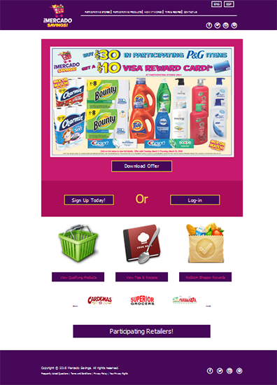 Consumers who purchase $15 worth of qualifying products (qualifying products will change monthly) at participating Mercado Savings stores can send in a picture of their receipt by texting the keyword MERCADO to 811-811, by email to commuications@mercadosavingsloyalty.com or via web upload at mercadosavings.com. Post validation by SnippCheck they will receive a $10 Visa Gift Card.