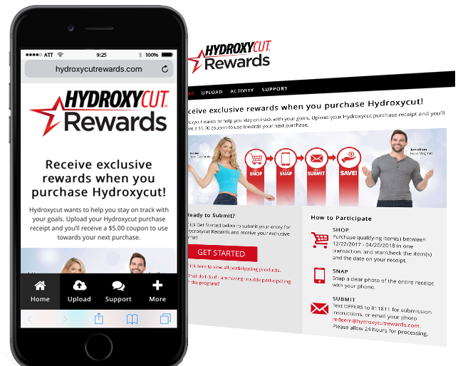 Iovate needed a way to bring its Hydroxycut weight loss product to life with a program that could build loyalty, brand awareness, product trial, and inform consumers all at the same time. Snipp created a continuity rewards program that allowed consumers to earn coupons off their first three purchases. If the consumer submits their receipt proving purchase of eligible Hydroxycut products, they earn a $5 coupon off their next purchase. They can repeat this process up to three times for ongoing savings. Receipt submissions are facilitated through text, email, and web upload. To text in the receipt, consumers send the keyword OFFERS to 811-811; to email it, they send it to redeem@hydroxycutrewards.com; and to upload it, they can engage with a custom branded microsite.