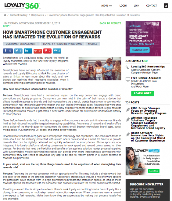 Smartphones have certainly influenced the evolution of rewards and Loyalty360 spoke to Mark Fortuna, director of sales at Snipp, to learn more about this topic and how brands can optimize their respective strategies when it comes to offering a compelling mix of rewards.
