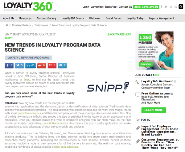 When it comes to loyalty program science, Loyalty360 talked to Eoin O’Sullivan, Global Director of Business Intelligence at Snipp, to find out the latest trends that loyalty marketers should be aware of and incorporate into their respective business strategies.