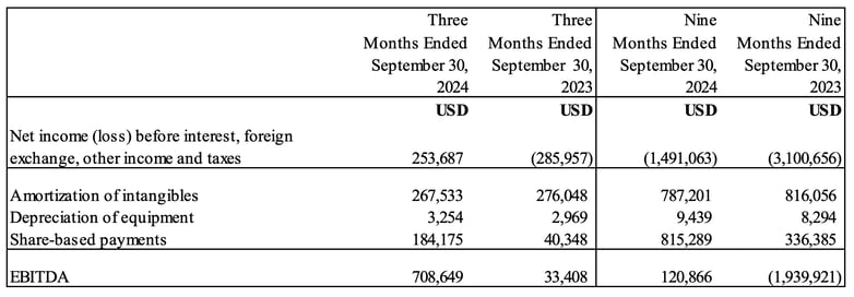 - EBITDA in the first 9 months of 2024 was $120,866 vs an EBITDA loss of $1,939,921 in the first 9 months of 2023, an improvement of $2,060,787.