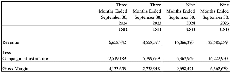 - Gross Margin for the first 9 months of 2024 increased by 114% from 28% in the first 9 months of 2023 to 60% in the first 9 months of 2024.