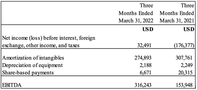 Snipp defines earnings before interest, taxes, depreciation and amortization (“EBITDA”) as revenue minus operating expenses excluding non-cash operating expenses of share-based payments, depreciation and amortization (interest and taxes are not included in the Company’s operating expenses).