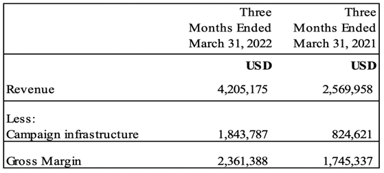- Cash at the end of Q1 2022 stood at $1,899,110 and the company continues to be debt free. The previously announced $5,000,000 investment from Bally’s (USD$0.20 per share) took place subsequent to Q1 2022 and will be recognized in our Q2 2022 financials.