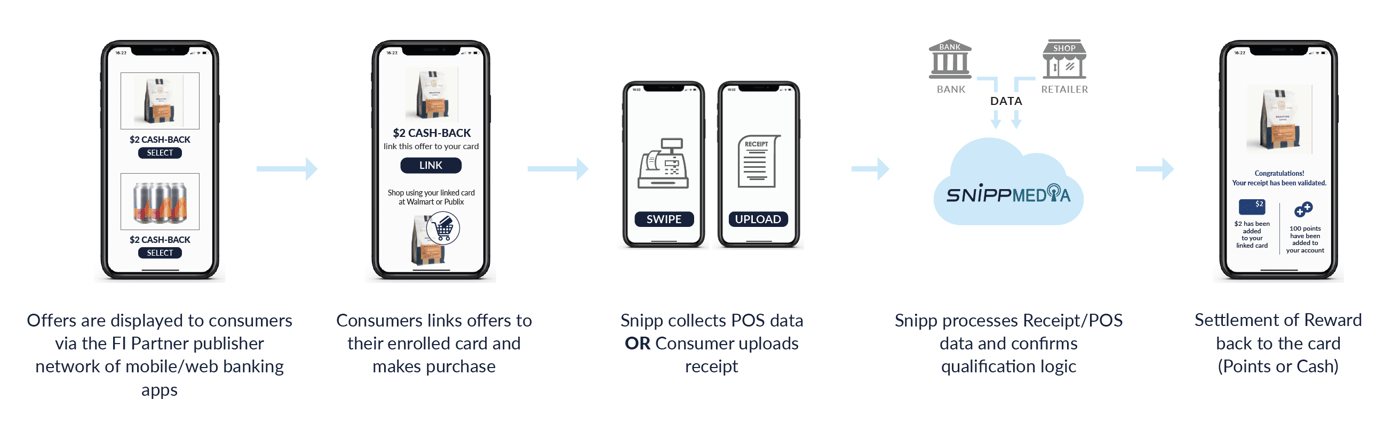 Snipp has partnered with tier-one banks and other publishers to create our Financial Media Network allowing you to deliver SKU-level, grocery cash-back offers on credit/debit card reward programs. Open a brand new, shopper marketing advertising channel with a reach of 67M+ consumers.