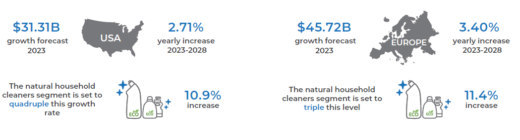 • The European home cleaning market is estimated to reach US$45.72bn in 2023 with an annual growth of 3.40% from 2023 to 2028. The growth of natural household cleaners in Europe is set to triple this level, with a projected increase of 11.4%.