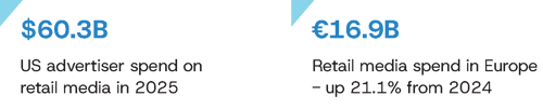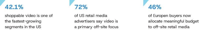 Shoppable video and off-site retail media bring “add to cart” to the open web. In the US, shoppable video is one of the f astest-growing segments, up 42.1% in 2025, with 72% of retail media advertisers saying video is a primary off-site focus. In Europe, off-site retail media is gaining traction as well: 46% of buyers now allocate meaningful budget to it, up from 30%, driven by display and social formats.